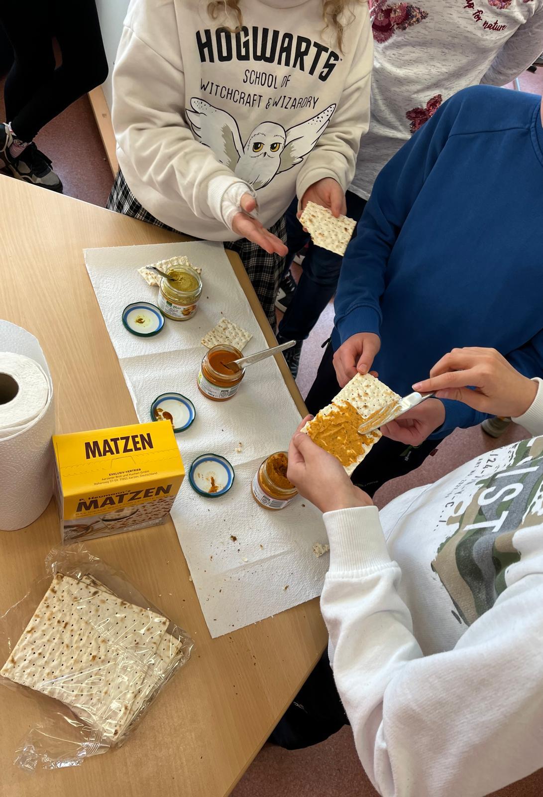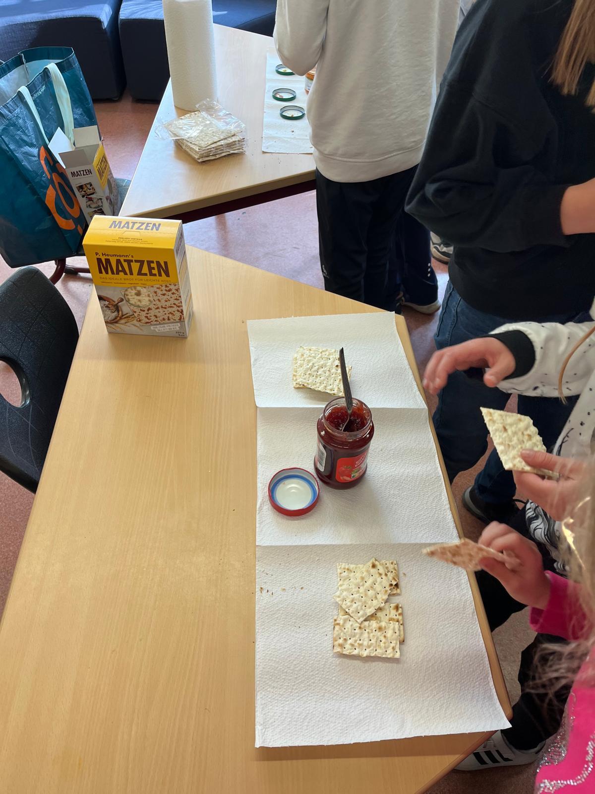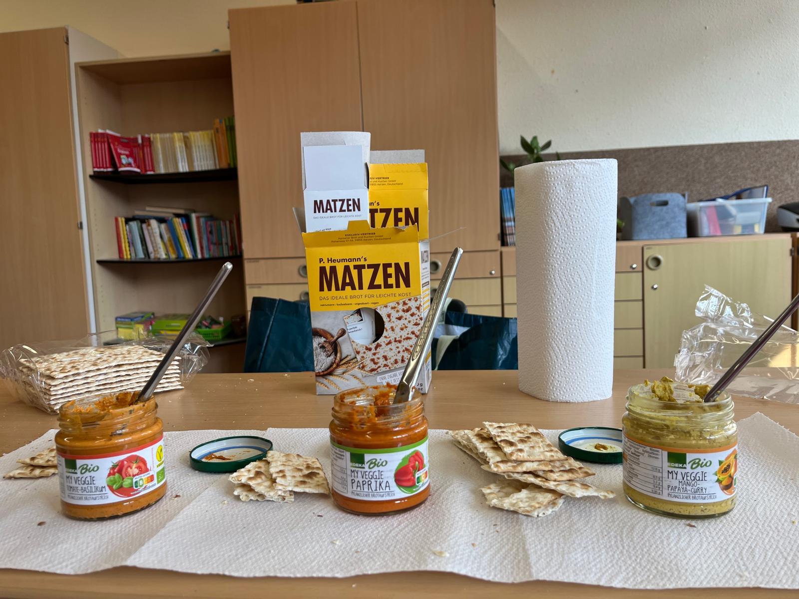 Eine zentrale Rolle spielt beim Essen am Vorabend die Mazze, das ist ungesäuertes Brot. Dies gibt es auch im Supermarkt bei uns zu kaufen. Kurzerhand wurde eine Verkostung organisiert. Da Mazze allein nur wenig schmeckt, besorgte Frau Kollmann einige herzhafte Brotaufstriche und für die Süßmäulchen als Alternative etwas Marmelade.