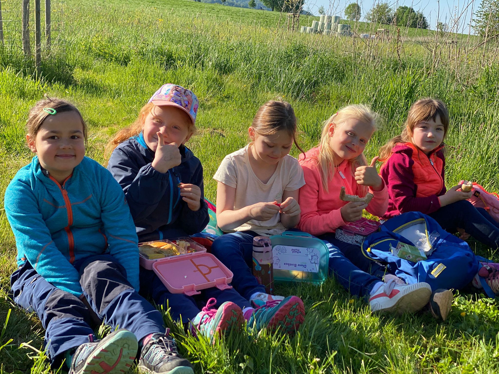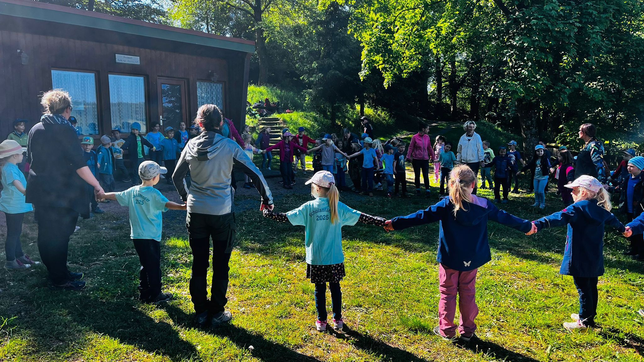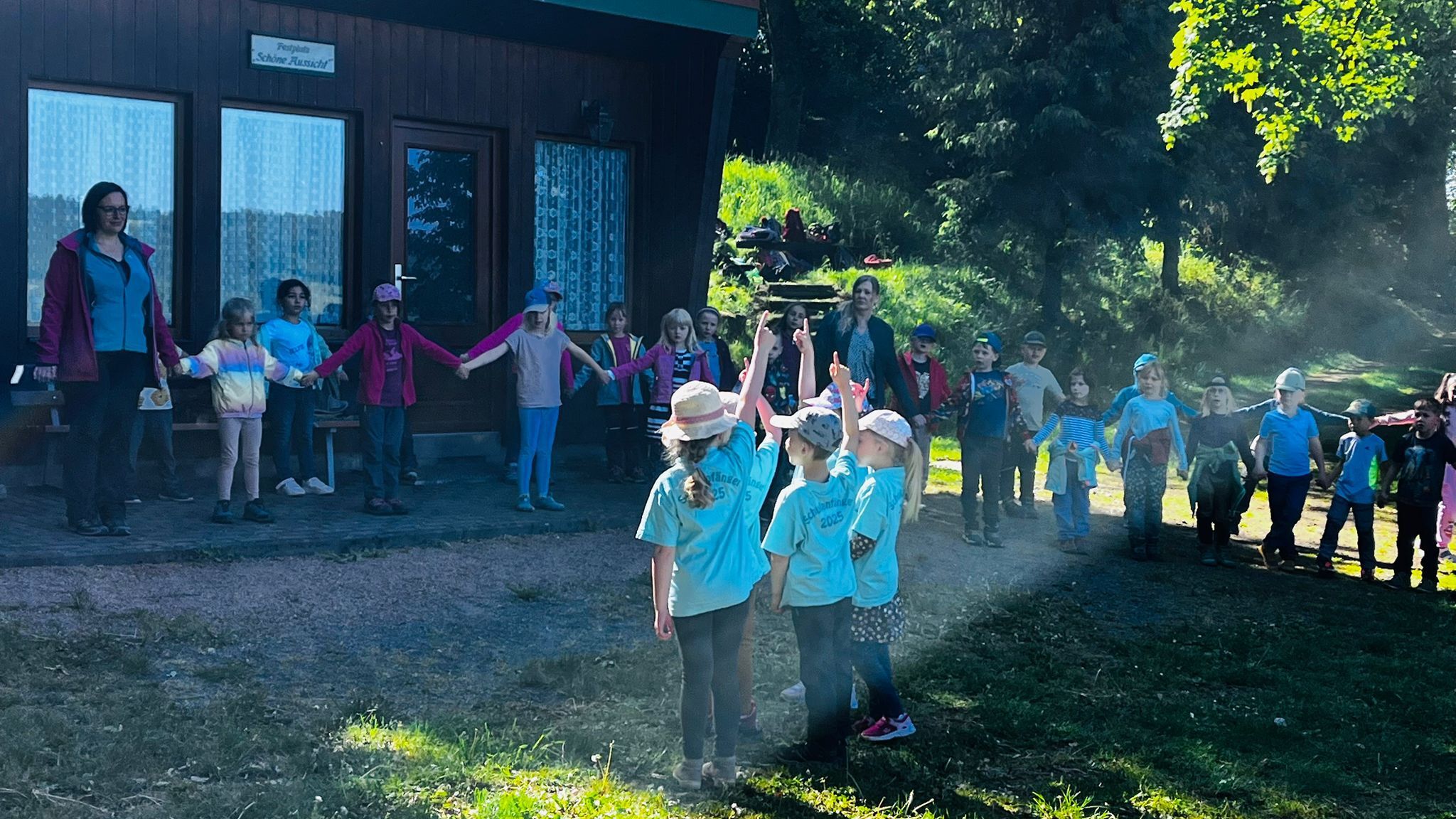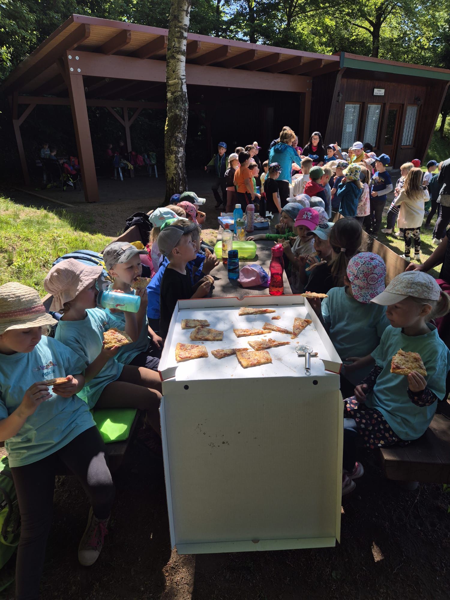 Am 13. Mai startete früh am Morgen erstmalig unsere seit langem geplante Sternwanderung. Aus Seligenthal und Schnellbach machten sich die aktuellen Schulanfänger auf ihren Weg. Die ersten Klassen nahmen die Kleinschmalkalder Howete-Kinder unter ihre Fittiche. Auf ging es auf verschiedenen Wegen und Pfaden, zum Beispiel mit einer Rast am Bienenlehrpfad, vorbei am Grünen Klassenzimmer und einem Stopp am Waldspielplatz. Gemeinsames Ziel war der Platz zur Schönen Aussicht zum gegenseitigen Kennenlernen. Nach einigem gemeinsamen Spaß und Spiel ging es in kleinen Grüppchen eine Runde über den nahegelegenen Trimm-Dich-Pfad. Pünktlich zum gemeinsamen Mittagessen waren alle wieder da. Dieses wurde von dem ortsansässigen Imbiss direkt zum Treffpunkt geliefert: Pizza im Wald - das hatte was Besonderes.