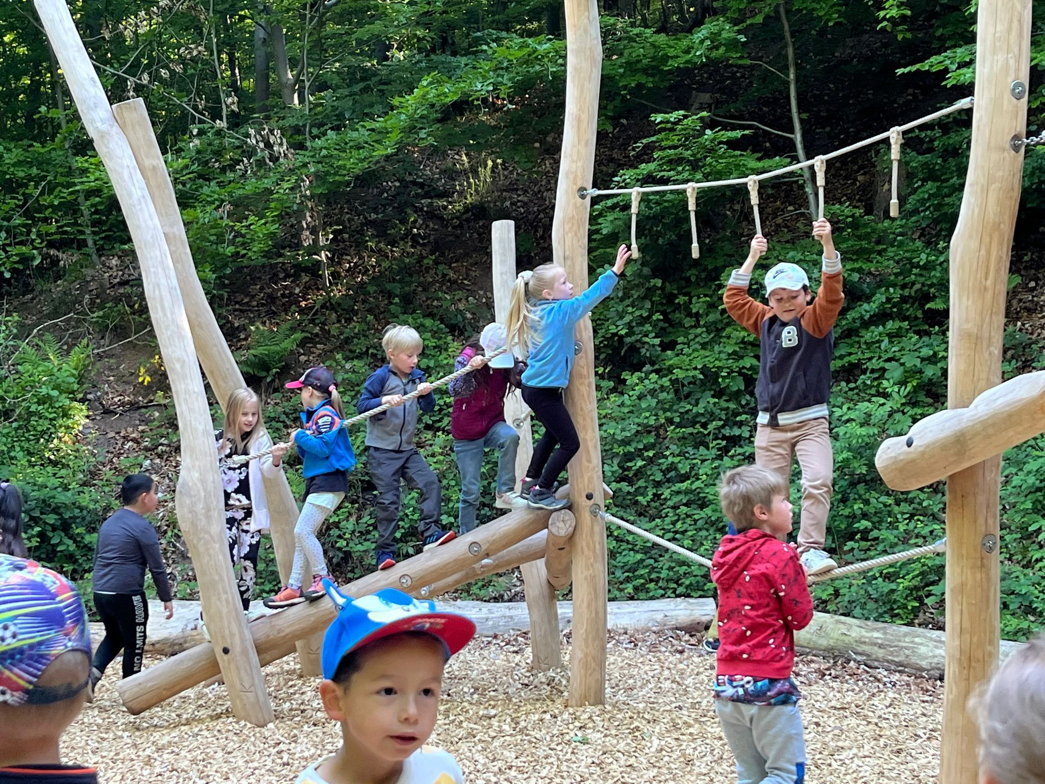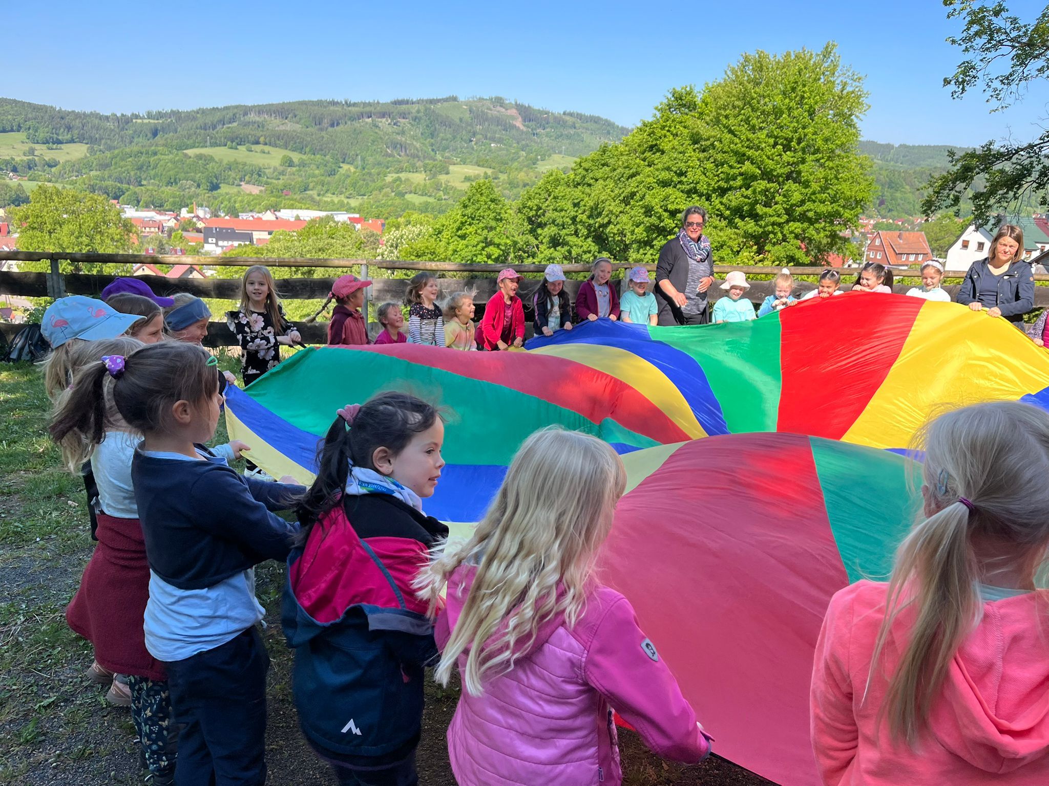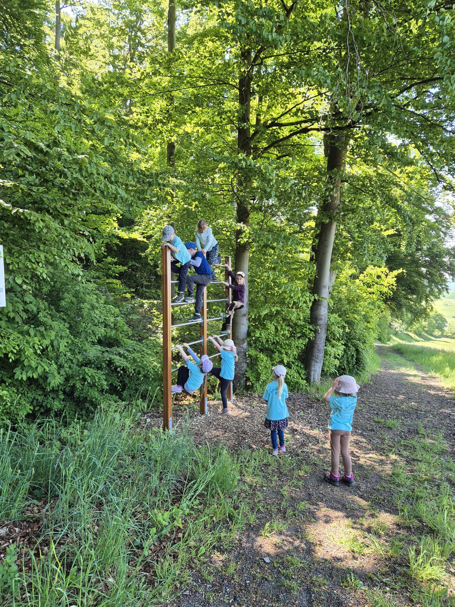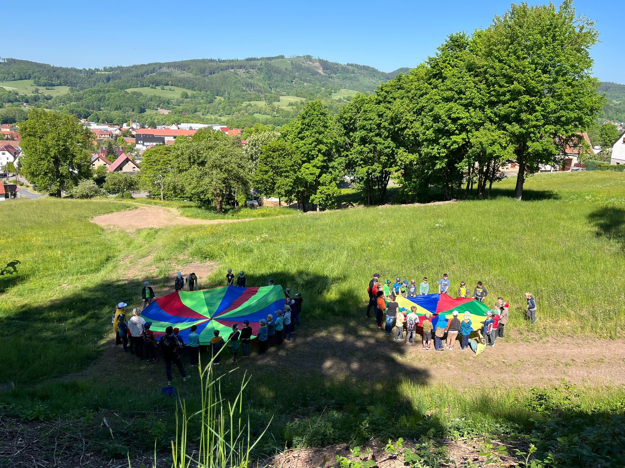 Am 13. Mai startete früh am Morgen erstmalig unsere seit langem geplante Sternwanderung. Aus Seligenthal und Schnellbach machten sich die aktuellen Schulanfänger auf ihren Weg. Die ersten Klassen nahmen die Kleinschmalkalder Howete-Kinder unter ihre Fittiche. Auf ging es auf verschiedenen Wegen und Pfaden, zum Beispiel mit einer Rast am Bienenlehrpfad, vorbei am Grünen Klassenzimmer und einem Stopp am Waldspielplatz. Gemeinsames Ziel war der Platz zur Schönen Aussicht zum gegenseitigen Kennenlernen. Nach einigem gemeinsamen Spaß und Spiel ging es in kleinen Grüppchen eine Runde über den nahegelegenen Trimm-Dich-Pfad. Pünktlich zum gemeinsamen Mittagessen waren alle wieder da. Dieses wurde von dem ortsansässigen Imbiss direkt zum Treffpunkt geliefert: Pizza im Wald - das hatte was Besonderes.